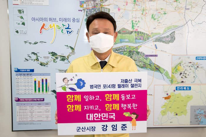 25일 군산시에 따르면 강임준 시장은 지난 24일 출산과 관련해 ‘함께 일하고, 함께 돌보고, 함께 지키고, 함께 행복한 대한민국’을 만드는데 동참하자는 취지로 진행되고 있는 ‘저출산 극복 함께해요! 범국민 포(4)함 릴레이 챌린지’에 동참했다.