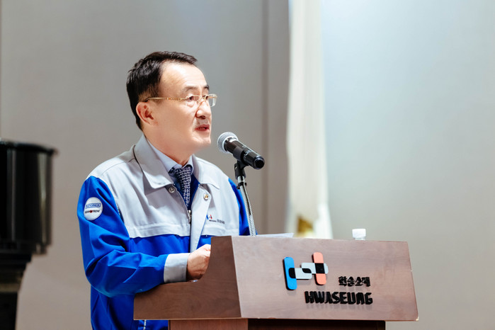 | ▲화승소재 허성룡 대표이사가 인사말을 전하고 있다.(사진제공=화승소재) |