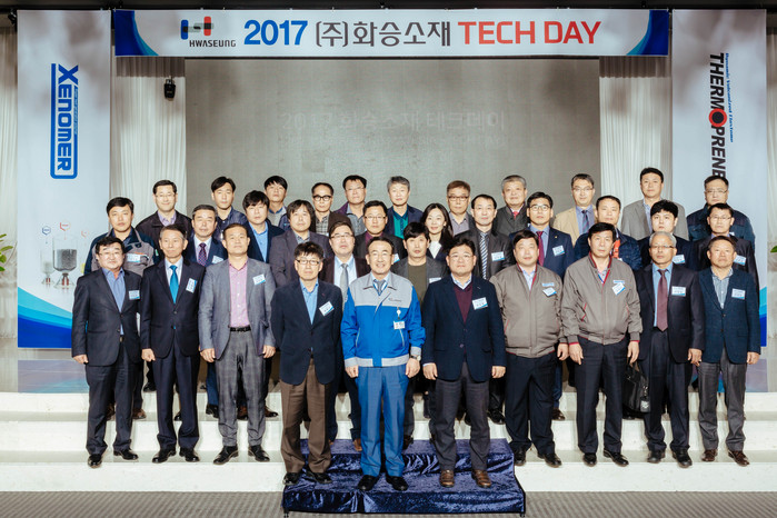 | ▲화승소재가 경남 양산서 가진 기술설명회 테크데이와 관련 기념사진을 찍고 있다.(사진제공=화승소재) |