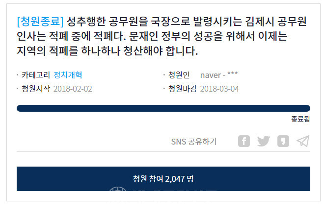 | ▲ 김제시 간부 공무원 성희롱 의혹과 관련된 청와대 청원글 갈무리 <출처=청와대> |