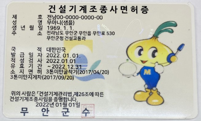 [세계로컬타임즈 박종현 기자] 무안군은 최근 건설기계조종사 면허증 카드발급 시스템을 도입해 운영 중이다.