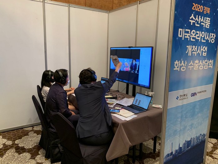 | ▲ 2020 경북 수산식품 미국온라인시장 개척사업을 화상 수출상담회에서 화상 상담을 실시하고 있다.(사진=경북도 제공) |