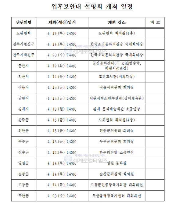 [세계로컬타임즈 조주연 기자] 전북선거관리위원회가 제8회 전국동시지방선거에 출마할 입후보예정자와 정당 관계자 등을 대상으로 각 선거구 선거관리위원회별로 입후보안내 설명회를 개최한다.