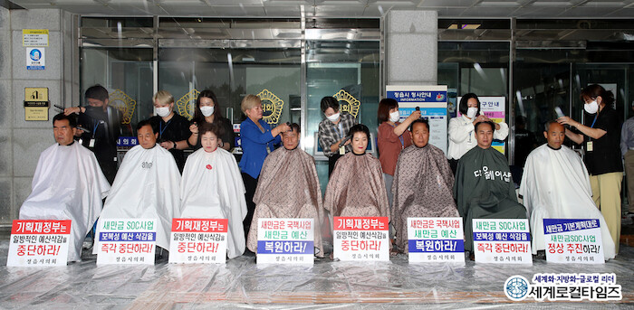[세계로컬타임즈 조주연 기자] 전북 정읍시의회가 새만금 SOC 사업 예산 삭감에 반대하는 삭발식을 거행하고 규탄대회를 가졌다.