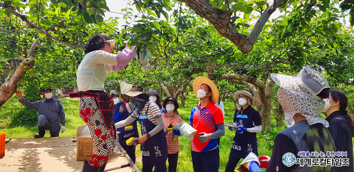 13일 전북농기원에 따르면 농촌지원국 직원 16명은 지난 10일 완주군 용진읍 배 농가 포장에서 배 마무리 적과 및 봉지씌우기 작업을 실시했다.