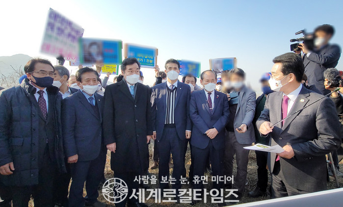 | ▲지난 20일 오후, 이낙연 대표가 부안군 하서면 해창석산 부지에서 권익현 군수로 부터 현안사업을 듣고 있다. |