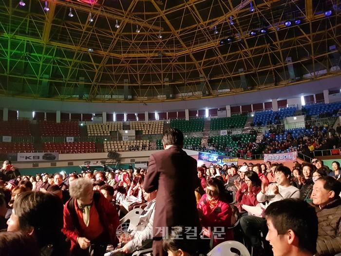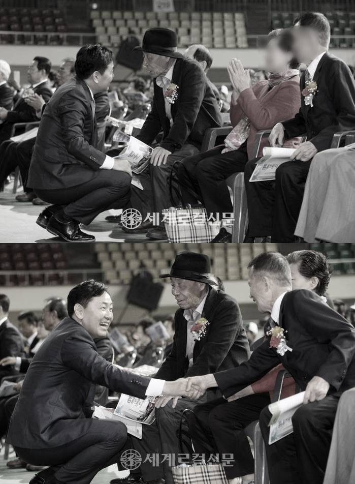 [세계로컬신문 조주연 기자] 지난 14일 오후 전북 군산월명체육관에서 열린 제27회 새만금 벚꽃아가씨 선발대회를 찾은 김관영(바른미래당·군산) 국회의원이 몸을 낮추고 행사장을 찾은 한 주민과 이야기를 나누고 있다.