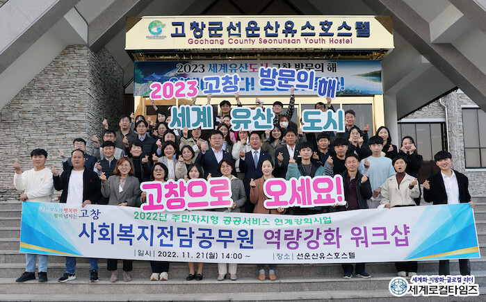 23일 고창군에 따르면 지난 21일 선운산유스호스텔에서 진행된 워크숍에서 ▲초청강연(광산구청 복지교육국장 엄미현) ▲민선8기 공약 및 군정철학 ▲주민생활현장의 공공서비스 연계강화사업 중간보고 ▲사회복지직 공무원 역량 강화 방안 토의 및 발전 방향 논의 등이 진행됐다.