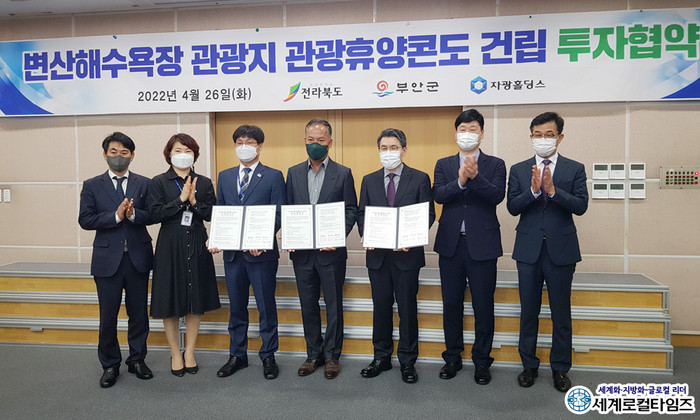 27일 부안군에 따르면 지난 26일 전북도청에서 조봉업 전북행정부지사, 김창조 부안군행정복지국장, 자광홀딩스 전은수 대표가 변산면 대항리 612번지 4만 3887㎡부지에 2022년부터 2024년까지 총 2004억 원을 투자해 관광휴양콘도를 건립하는 등의 협약을 맺었다.