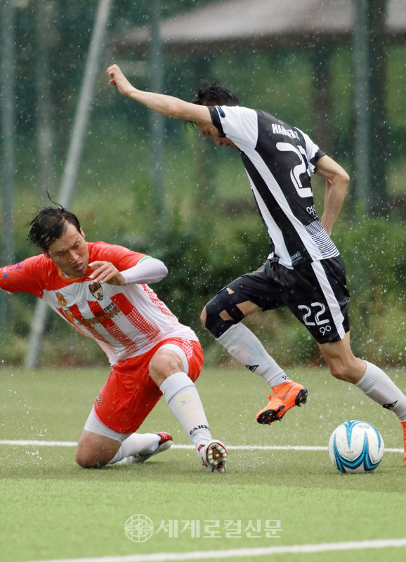 [세계로컬신문 조주연 기자] 1일 오후 전북 김제시 축구전용구장에서 전북도지사배 한마음축구대회 결승전에 오른 군산 한백축구단과 익산 평화축구단이 경기를 치르고 있다.