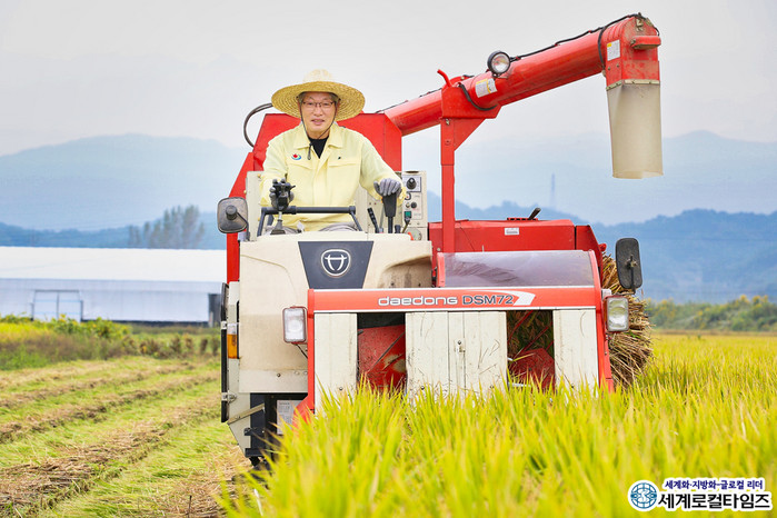 [세계로컬타임즈 조주연 기자] 유진섭 전북 정읍시장이 벼 수확현장을 찾아 일손을 돕고 농민 목소리 경청에 나섰다.