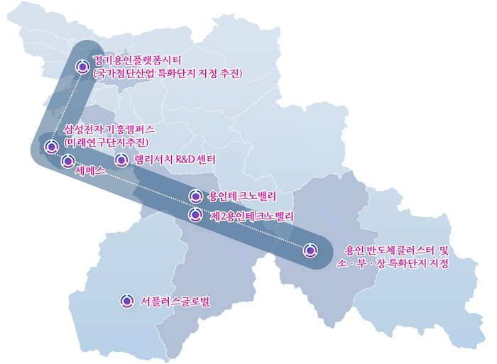 반도체 벨트는 기흥구 일원에 들어서는 용인 플랫폼시티 내 소·부·장 연구 및 제조시설(44만㎡)부터 삼성전자 기흥캠퍼스 미래연구단지(108만㎡), 기흥미래첨단산업단지(세메스·11만㎡), 지곡일반산업단지(램리서치R&D센터·7만㎡), 통삼일반산업단지(서플러스글로벌·5만㎡), 제2용인테크노밸리(27만㎡), 용인 반도체클러스터(416만㎡), 원삼반도체협력단지(사업단지 물량 협의 중·24만㎡)까지 L자 모양으로 이어진다. 총면적은 642만㎡(약194만평)다.