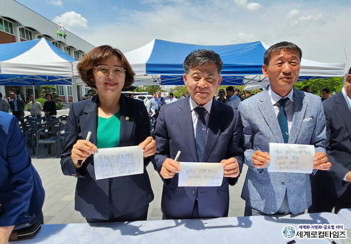 [세계로컬타임즈 글·사진 조주연 기자] 정성주 전북 김제시장과 김영자 김제시의장, 한유승 김제시 체육회장이 지난 24일 전북도민체전 D-100일을 맞아 진행한 디데이 카운터 제막식에서 도민체전 소망지를 작성한 후 카메라 앞에서 포즈를 취하고 있다.