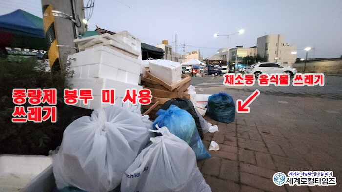 지난 2일 18시, 노점상인들이 떠난자리에 야채 등 음식물 쓰레기가 파란봉지에 담겨 버려져 있었다. 종량제봉투를 사용해야할 각종 쓰레기는 일반 비닐봉지에 담겨 쌓아 놓았다. 생선을 담았던 나무상자, 스티로폼 박스들도 널브러져 있다.