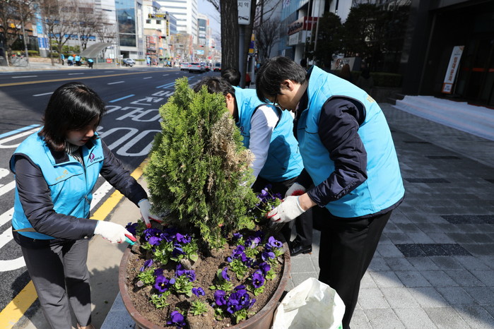 | ▲ 대전도시공사 임직원이 선화동 등 원도심 일원에서 대형화분에 봄꽃을 식재하고 있는 모습. |