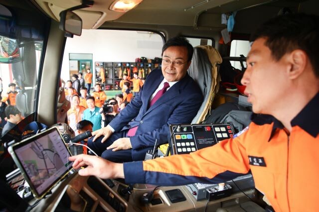 ▲ 김성제 의왕시장이 긴급차량에 대해 관계자로부터 설명을 듣고 있다.(사진=의왕시) |