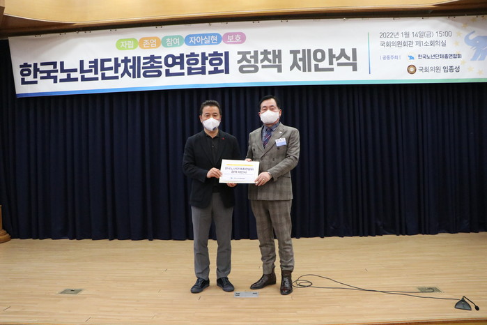 | ▲ 배범식(오른쪽) 한국노년단체총연합회 상임부회장이 더불어민주당 임종성 의원(4050위원회 위원장, 왼쪽 사진)에게 1,300만 노년세대를 위한 복지정책을 담은 제안서를 전하고 상호지지와 협력을 강화하는 협약식을 가졌다. (사진=한국노년단체총연합회) |
