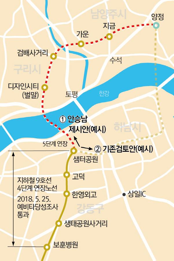 | ▲ 안승남 더불어민주당 구리시장 후보가 제시한 지하철 9호선 연장 노선. |