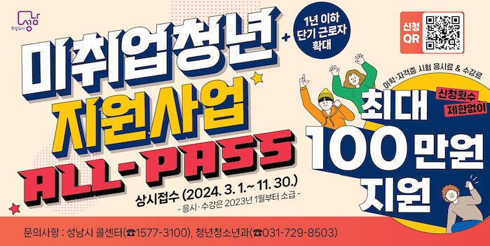 [세계로컬타임즈 온라인뉴스팀]성남시는 최대 100만원의 어학·자격증 시험 응시료와 학원 수강료를 지원받을 수 있는 ‘미취업 청년 지원사업(ALL-Pass)’을 하반기부터는 대상자 확대 모집한다.