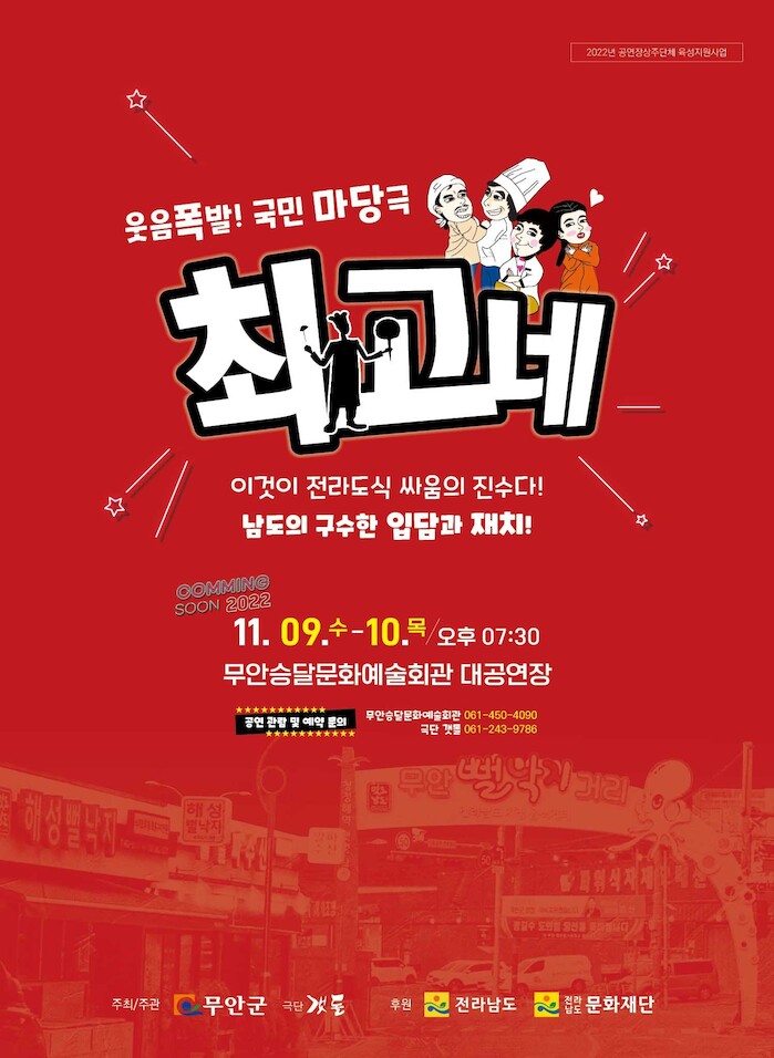 [세계로컬타임즈 박종현 기자] 전남 무안군은 오는 9일과 10일에 승달문화예술회관 대공연장에서 서로가 원조라고 주장하는 뻘낙지 전문식당을 운영하는 두 원수의 집안이야기를 소재로 한 유쾌한 마당극 ‘최고(崔高)네’를 상연한다.