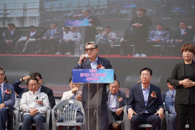▲ 제6회 경기도지체장애인체육대회에서 김기호 협회장이 대회사를 하고 있다(사진=경기지장협) |