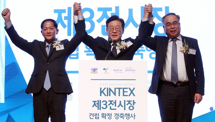 | ▲이재명(가운데) 경기지사와 이재준(왼쪽) 고양시장·임창열 킨텍스 CEO가 킨텍스 제3전시장 건립 확정 경축행사에서 손을 맞잡고 화이팅을 외치고 있다. (사진=경기도 제공) |