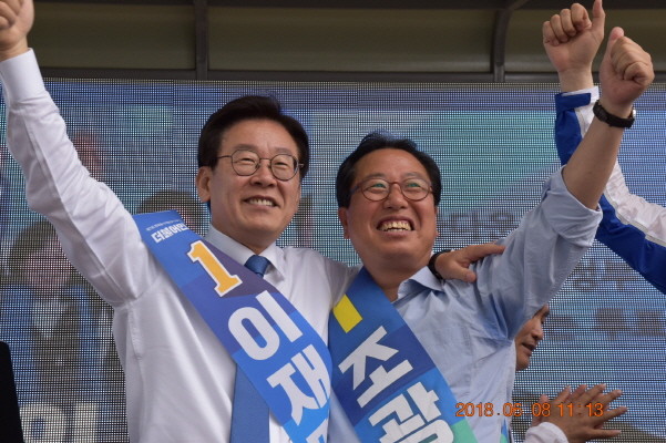 | ▲ 이재명 경기도지사 후보(왼쪽), 조광한 남양주시장 후보가 승리를 다짐하고 있다. <사진제공=조광한 후보사무실> |