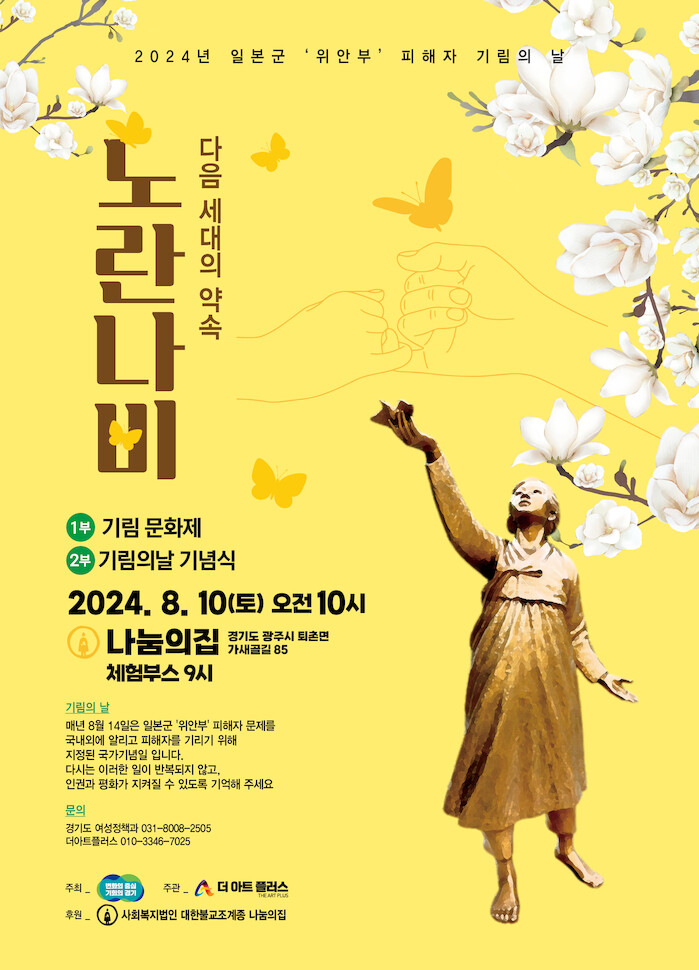 [세계로컬타임즈 온라인뉴스팀] 경기도는 8월 10일 오전 10시부터 경기 광주시 퇴촌면 나눔의집에서 ‘노란나비-다음 세대의 약속’을 주제로 일본군 ‘위안부’ 피해자 기림의 날 행사를 개최한다.