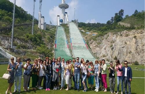 ▲ 강원도 관광상품을 취재하러 온 외국인들이 평창동계올림픽 경 기장에서 기념촬영하고 있다. <사진제공=강원도청> |