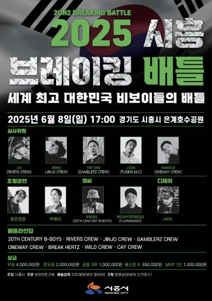 시흥시가 거리 문화의 대표 장르인 브레이킹(Breaking)의 향유 기회를 확대하기 위해 오는 6월 8일(일) 오후 5시 은계호수공원 일원에서 ‘2025 시흥 브레이킹 배틀’을 개최한다.