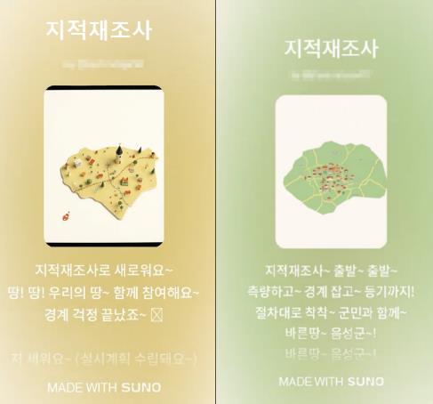 홍보송 구축 과정에는 AI가 활용됐다. 음성군청 민원과 지적재조사팀이 회의를 통해 메시지를 기획하고 가사는 ‘챗 지피티(ChatGPT)’로 제작, 음악 작곡은 AI 프로그램 ‘수노(Suno)’을 활용해 ‘지적재조사 AI 홍보송’을 완성했다.