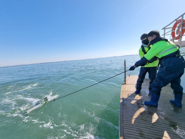 ▲ 경기바다의 미세플라스틱 오염정도를 측정하기 위해 바닷물을 채취하고 있다.(사진=경기도) |