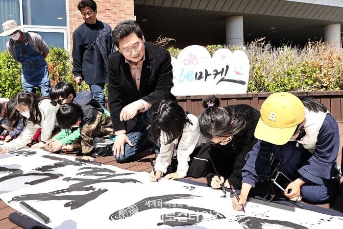 ▲ 이상일 용인시장이 아이들이 직접 붓으로 소망을 담은 글을 쓰고 있는 아이들을 바라보고 있다. (사진=용인시) |