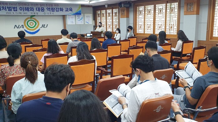 [세계로컬타임즈 강석운 기자] 나주시(시장 윤병태)는 15일 시청사 이화실에서 본청과 읍·면·동, 직속기관 등 현업 업무 및 사업담당자를 대상으로 ‘중대재해예방 직원 역량교육’을 가졌다고 밝혔다.