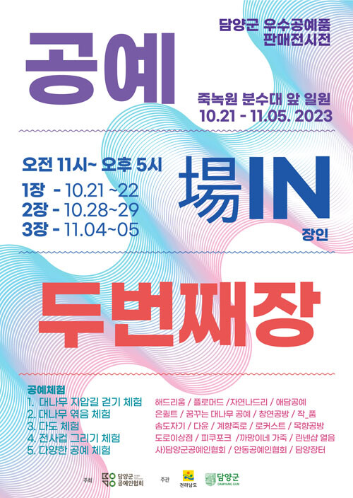 [세계로컬타임즈 이남규 기자] 전남 담양군과 담양군공예인협회가 죽녹원 분수대 광장에서 공예품 전시 판매행사 ‘공예 장인(場IN) 두 번째 장’을 개최한다.