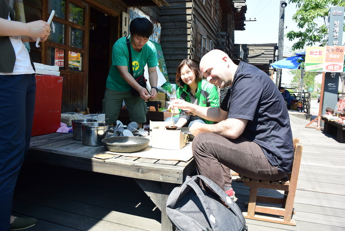 | ▲ 서울 청계천 판잣집 테마존을 찾은 한 외국인이 달고나 만들기 체험을 하며 즐거워 하고 있다. <사진제공=서울시청> |