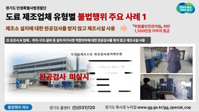 주요 위반 사례를 보면 오산시 A도료 제조업체는 위험물 제조소의 기술기준에 적합하도록 위치·구조·설비를 갖춰 완공검사를 받은 후 제조시설을 사용해야 함에도 완공검사를 받지 않고 사용하다 적발됐다.