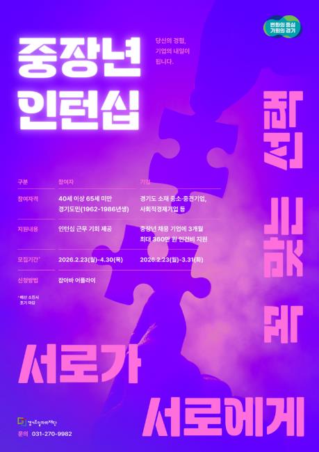 송은실 경기도 사회혁신경제국장은 “중장년 세대가 가진 경험과 역량이 도내 기업의 인력난 해소와 경쟁력 강화로 이어질 수 있도록 적극 지원하겠다”며 “구직자와 기업 모두의 많은 관심과 참여를 바란다”고 말했다.