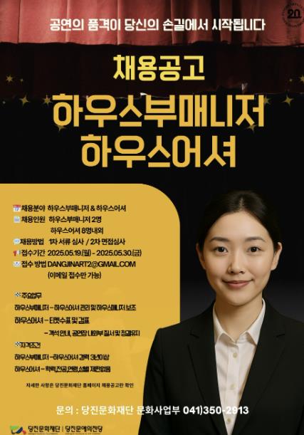 이번 채용은 당진문예의전당 현장 운영을 담당할 인력을 선발하는 것으로, 하우스부매니저 2명과 하우스어셔 8명 내외를 모집할 예정이다.