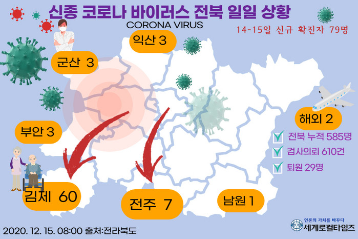 [세계로컬타임즈 조주연 기자] 전북도 보건당국은 14일~15일 사이 코로나19 신규 확진자가 79명 추가됐다고 밝혔다.