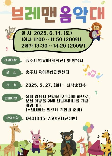 관람 신청은 5월 27일 충주시육아종합지원센터 누리집을 통해 가능하며, 좌석은 400명까지 선착순으로 마감한다.