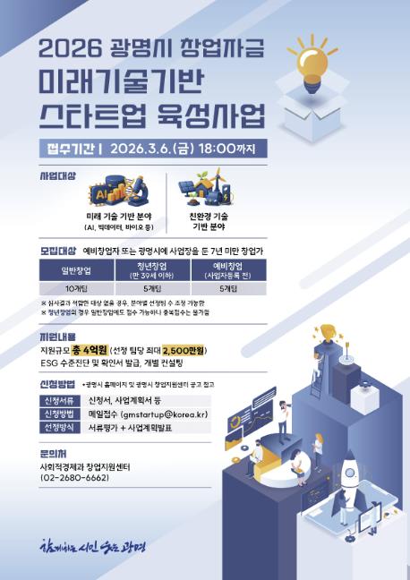 참여를 희망하는 창업자는 오는 3월 6일까지 광명시 누리집 또는 광명시 창업지원센터 누리집 공고를 확인한 뒤 이메일로 제출하면 된다.
