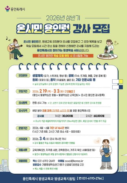 해당 분야 전문 자격을 갖춘 용인시민이라면 누구나 지원할 수 있다. 강사 등록은 연중 상시 가능하지만, 이번 상반기 강좌 운영은 반드시 정해진 모집 기간(2월 19일~3월 3일) 내에 등록을 완료한 강사에 한해 연결이 진행된다.