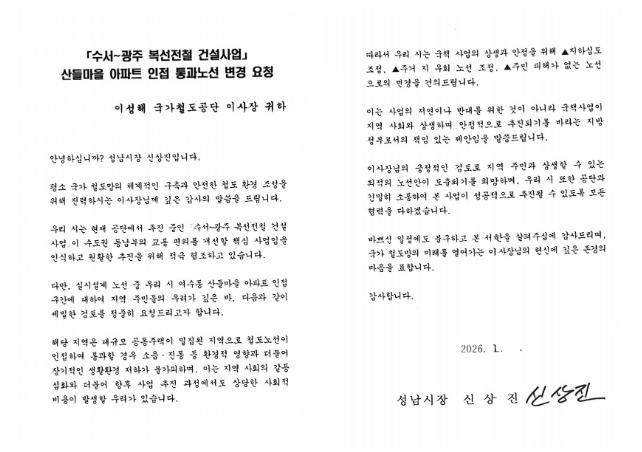 성남시는 서한을 통해 “수광선은 수도권 동남부의 교통 편의를 개선할 핵심 사업임을 인식하고 원활한 추진을 위해 적극 협조하고 있다”면서도, “실시설계 노선 중 산들마을 아파트 인접 구간에 대해 지역 주민들의 우려가 매우 깊어 세밀한 검토가 절실하다”고 강조했다.