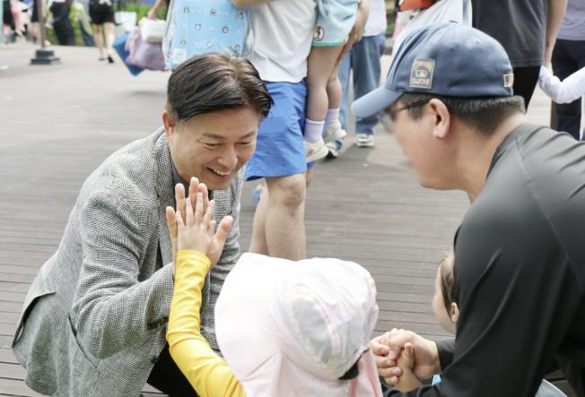 조용익 부천시장이 지난 7일 중앙공원 물놀이장 개장식에서 어린이들과 하이파이브를 하고 있다.