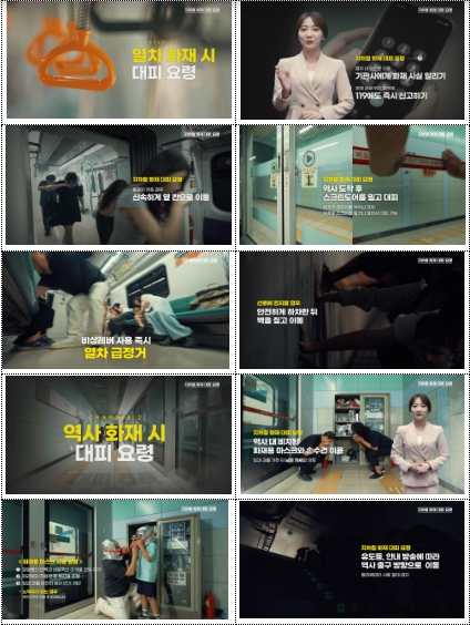 영상은 열차 내 화재대응, 역사 내 화재대응 등 2가지 상황으로 구성되며, 시간흐름에 따른 행동요령과 안전시설·장비 위치 및 사용방법 등을 설명하는 형식으로 제작했다.