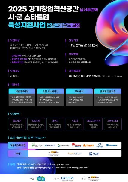 선정된 기업은 경기도 안양시에 위치한 남서부권 경기창업혁신공간에서 프로그램에 참여하게 되며, ▲역량강화 교육 ▲기술협업(오픈이노베이션) ▲투자연계 ▲글로벌 밋업 ▲기술실증(PoC) 등을 지원받을 수 있다.