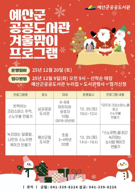 이번 프로그램은 6∼8세 어린이와 보호자를 대상으로 진행되는 △크리스마스 스노우볼 만들기와 초등 2∼4학년을 대상으로 진행되는 △스노우맨 케이크 만들기 체험으로 구성됐으며, 아이들이 책 내용을 창작 활동으로 연결하며 독서의 의미를 깊이 이해할 수 있는 기회를 제공할 예정이다.