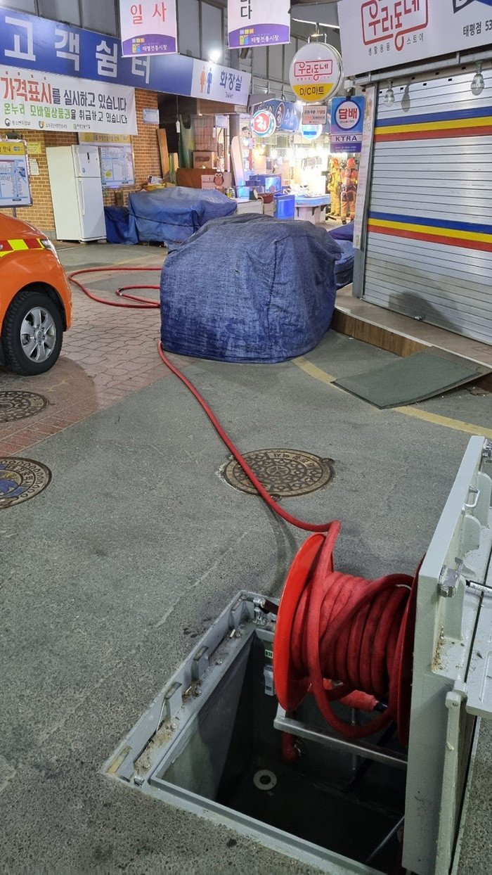 화재 점포 안에 설치된 화재알림시설이 연기를 감지, 119로 신고 돼, 출동 중 소방차량 진입이 어려울 것으로 판단, 출동한 소방대와 시장내 자율소방대가 함께 비상소화장치 호스릴을 30m 가량 전개해 진화에 성공해 큰 불을 막을 수 있었다.