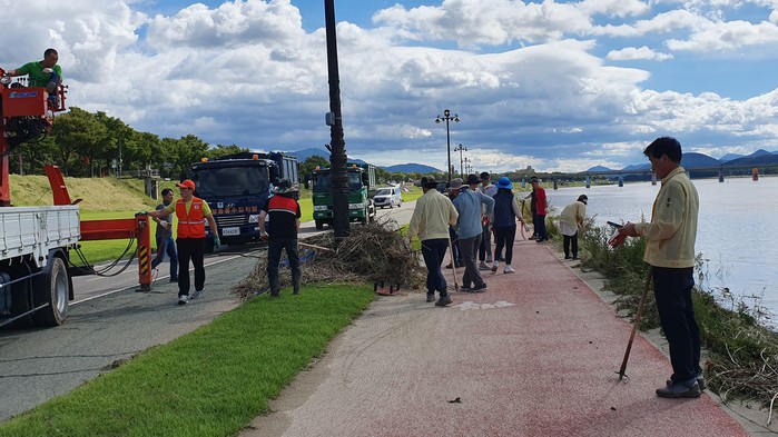 지난 3일 도시재생사업본부 직원 100여명은 휴일에도 불구하고 청소차량 3대 등 장비를 동원해 범람한 강물에 휩쓸려온 각종 부유물과 생활쓰레기 30여 톤을 제거했다.